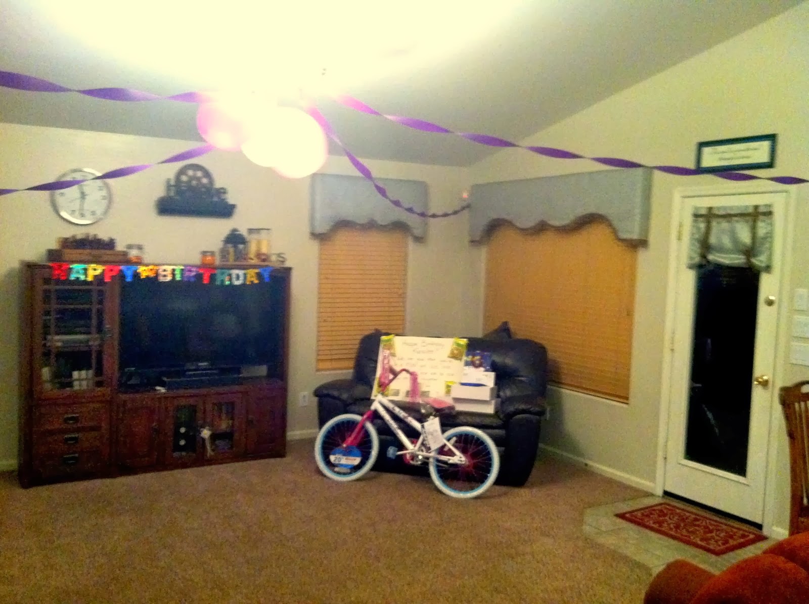 I like to decorate the family room and set all my kid's presents out the night before their birthday so they can wake up and open present right away. Here's Karalee's loot.